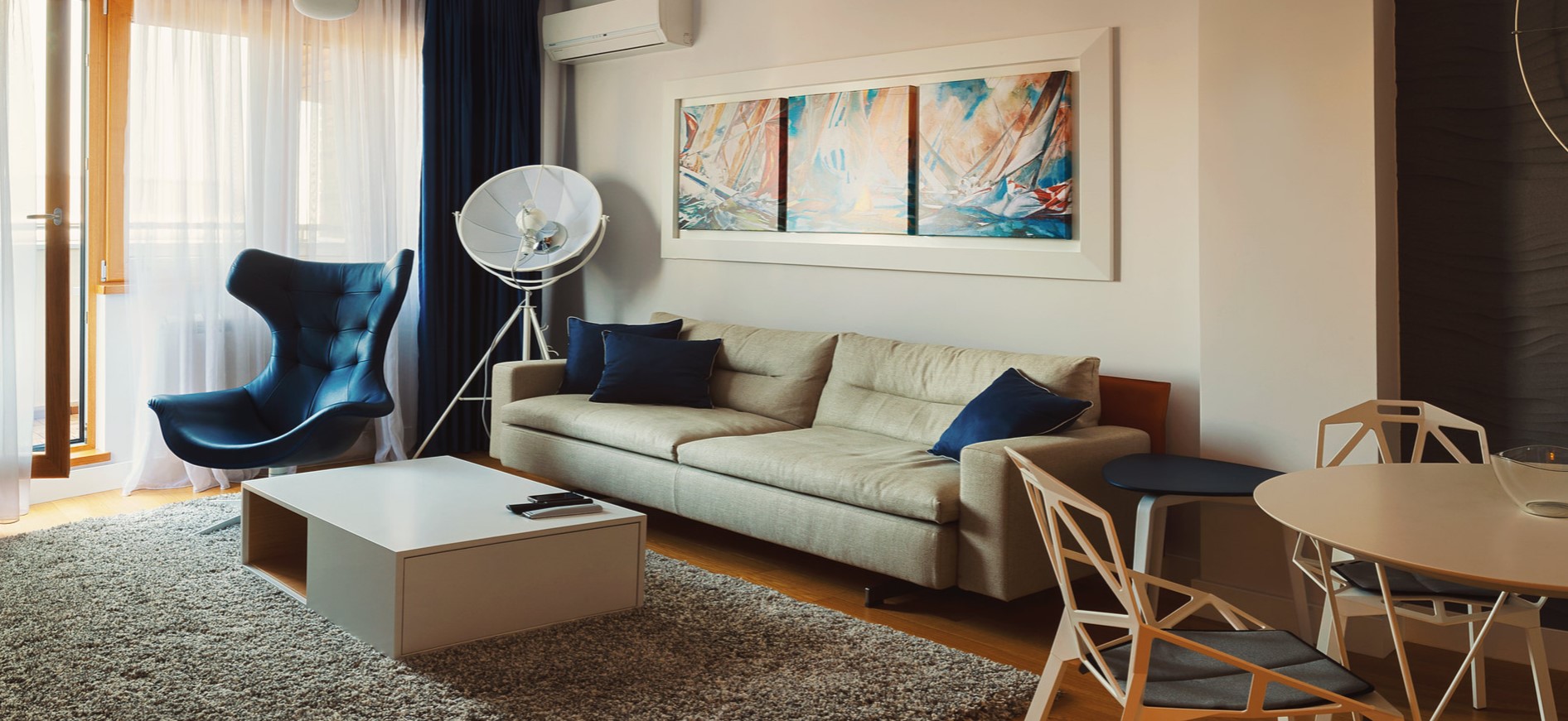 Синий диван и кресло являются оригинальным интерьерным акцентом в светлой гостиной