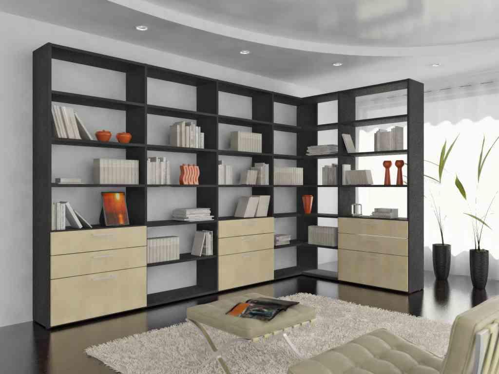 Современные модели стеллажей могут состоять из полок, оснащаться выдвижными ящиками, закрытыми витринами или консольными полками, выходящими за рамки основного каркаса. Также существуют варианты с полкой под телевизор.