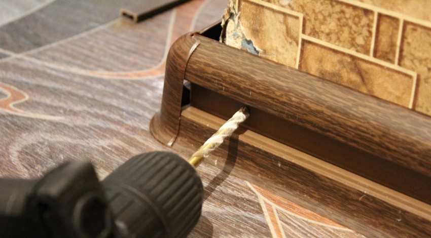 - Берем дрель с тонким сверлом по металлу 3-4 мм. Сверло берите подлиннее — чтобы не испортить патроном пластик. Делаем отметки на профиле и на стене.- В первую очередь сверлим по краям и в тех местах, где плинтус «отстает» от стены.