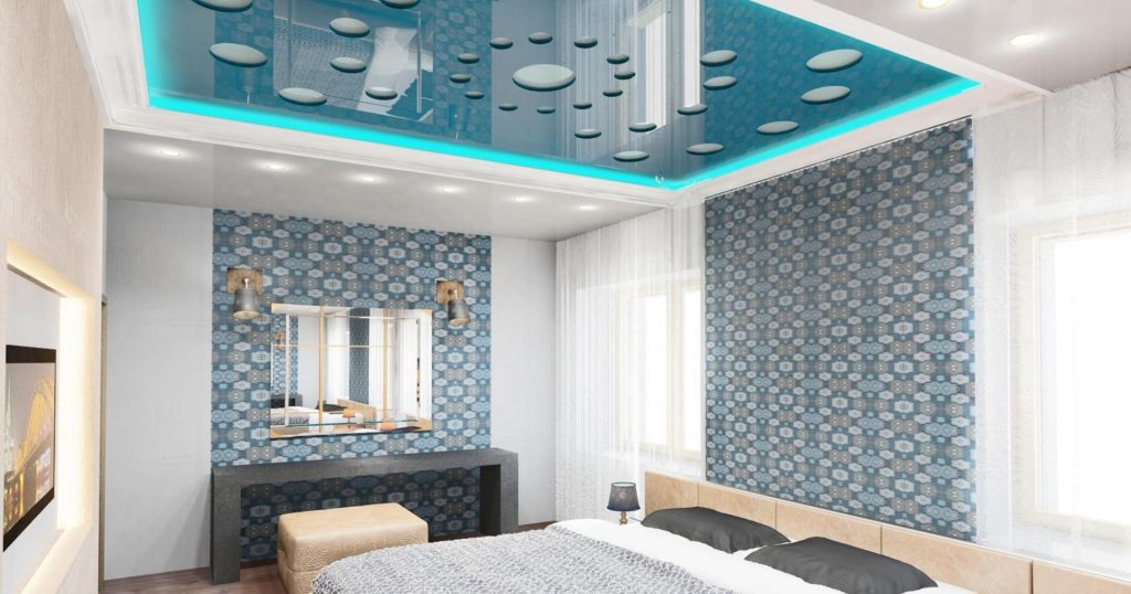 Также образцы натяжных потолков различаются по нанесению узоров, фотопечати, обустройству подсветки, дополнительных фигурных конструкций, уровней.