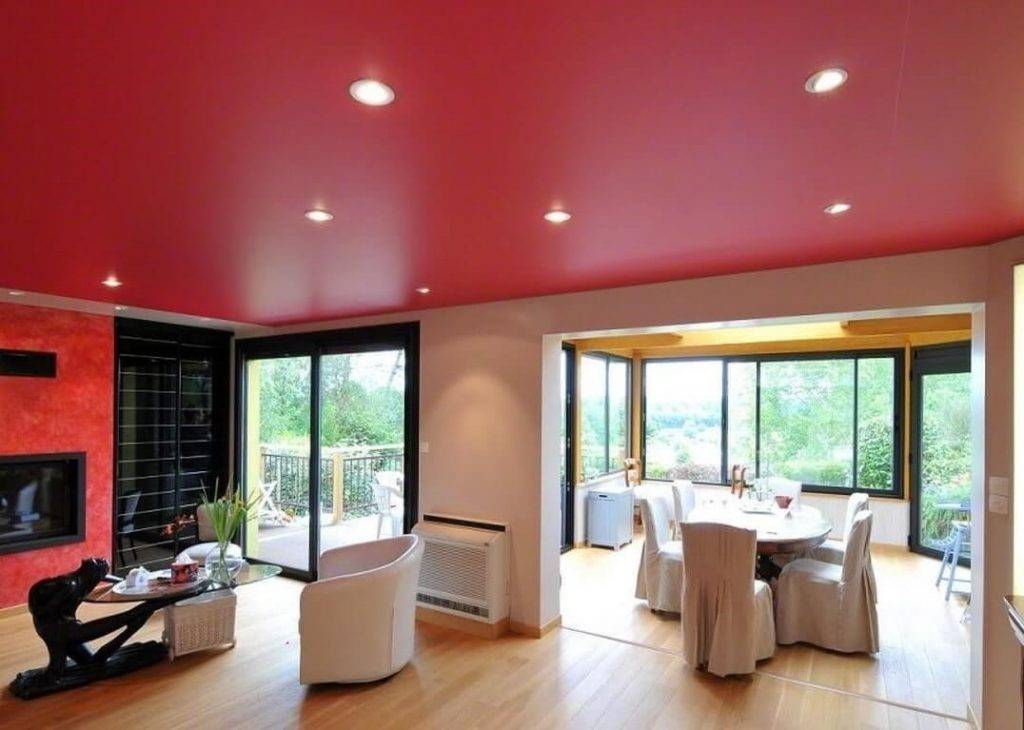 - Черно-белый или красно-белый потолок — лучшее решение для интерьера в стиле хай-тек, минимализм, лофт.