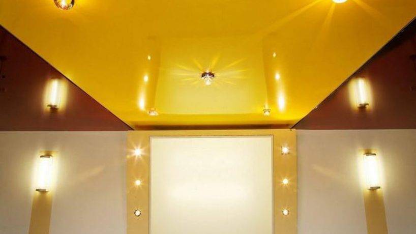 Устанавливая приборы освещения, учитывайте мощность вмонтированных в светильники ламп: не более 60 Вт для лампочек накаливания и 35 Вт для галогенных альтернатив. Иначе виниловое полотно попросту провиснет, или вокруг светильника на покрытии появится желтое пятно.