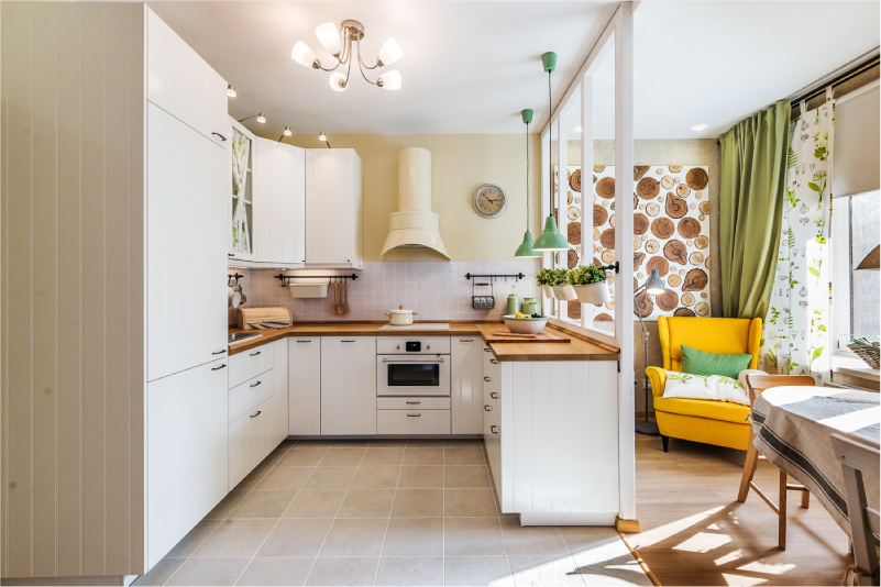 | Есть возможность спрятать коммуникации и проводку. Так, например, при установке натяжного потолка можно оснастить кухню точечными светильниками и повесить люстру прямо над столом. | Наличие швов на виниловых потолках (при большой площади кухни). Во-первых, швы, хоть и малозаметны (их толщина составляет менее 1 мм), но могут быть видны при пристальном рассмотрении. Во-вторых, швы являются слабым местом виниловых потолков. При некачественной сварке или из-за слишком сильного натяжения при установке полотно может порваться именно по шву (такое происходит не часто). |