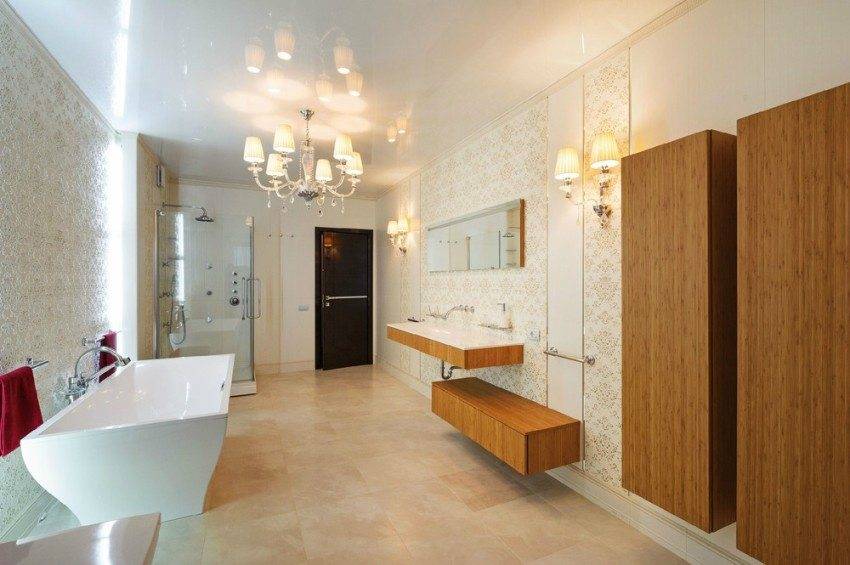 Натяжное полотно не боится влаги, поэтому часто используется в ванных комнатах