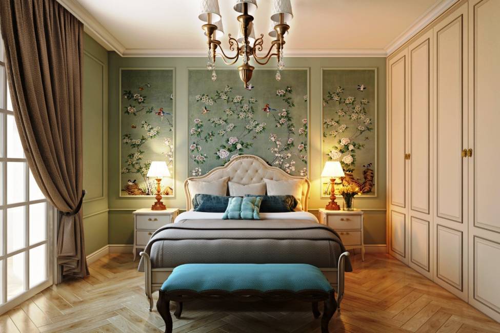 То же касается и спальни. «Королевская» кровать спокойно соседствует с простыми тумбами и торшерами. А поддержать классицизм могут молдинги на стенах, туалетный столик или шкаф.