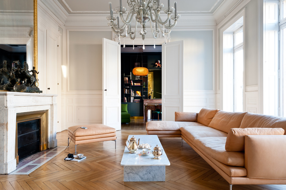 - Следование четким правилам расстановки предметов мебели и установки особых элементов. Проявляется в более сдержанной форме и адаптируется под современные потребности общества и тенденции. Применяются законы симметрии не только в размещении мебели, но и декора. Любые элементы (молдинги, панели, лепнина) приглушаются, чтобы выглядеть современно.