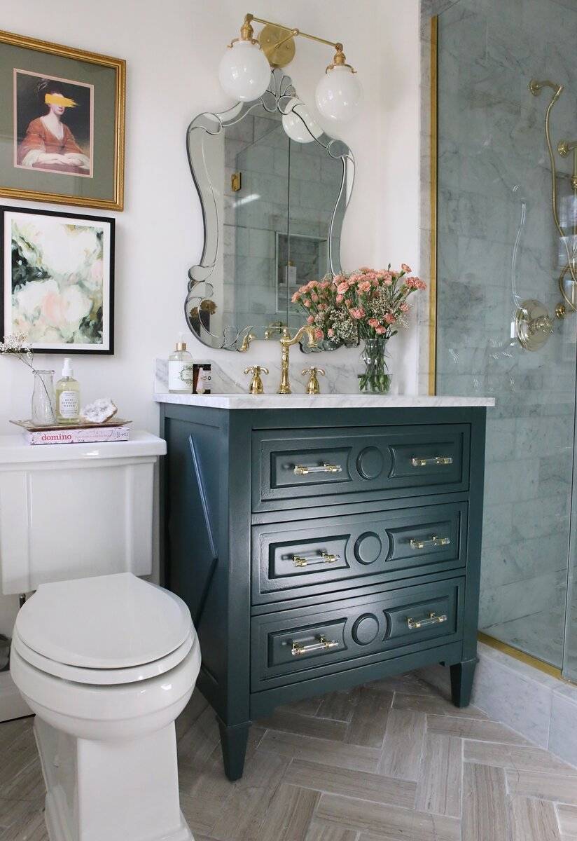 Ванная на изогнутых ножках, современные архитектурные детали, ниши, постаменты – вот основные черты для данной комнаты. Маленький санузел не подойдет точно. В качестве отделки используют керамическую плитку, керамогранит или камень. Мебель применяется деревянная. Красивым украшением послужат бра, статуэтки и зеркала.