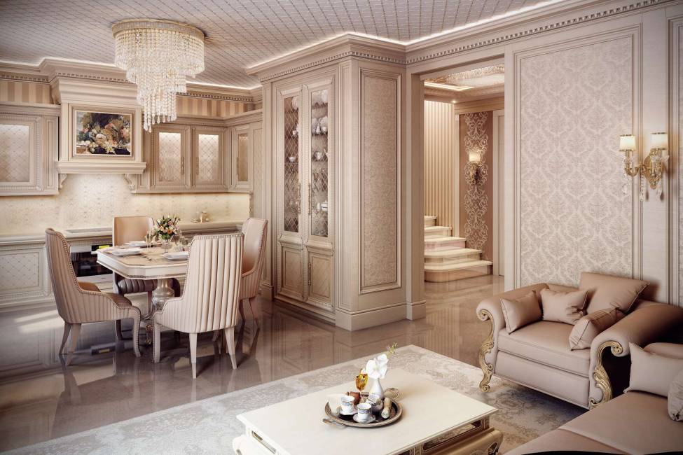 - Обязательное присутствие только классических деталей помимо остальных элементов: лепнина, арки, колонны, зеркала, классические узоры.