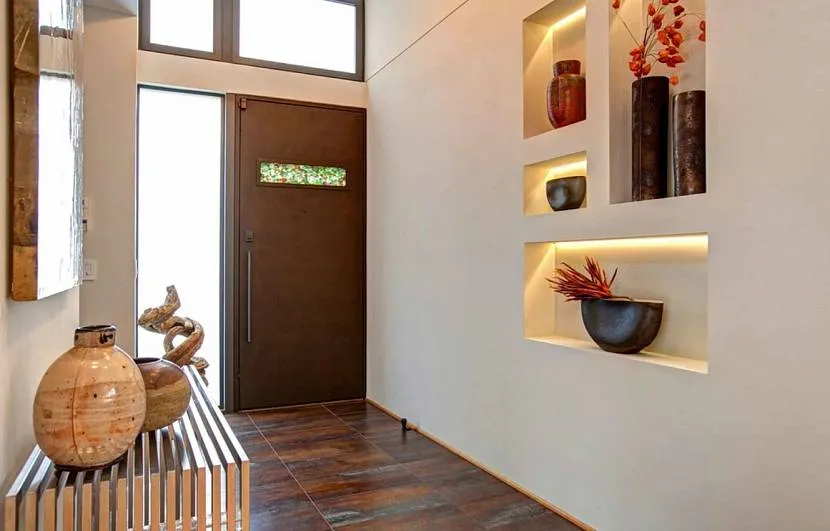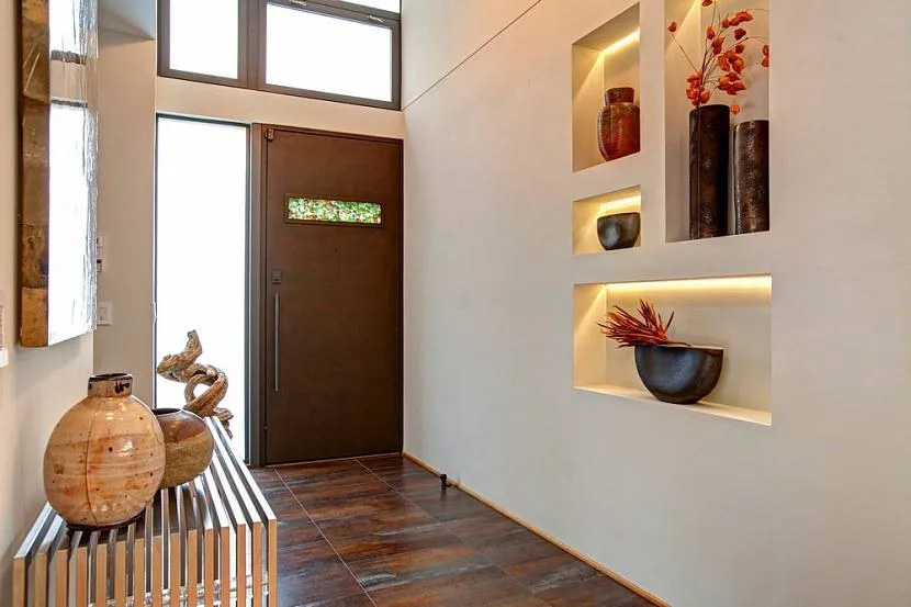 Даже небольшую прихожую можно удачно декорировать узкими конструкциями. Оформить крючками для одежды, корзинками для ключей, полочками. Создать динамичный интерьер помогут углубления разного размера с мягкой подсветкой, расположенные асимметрично. Оформление ниши в стене: