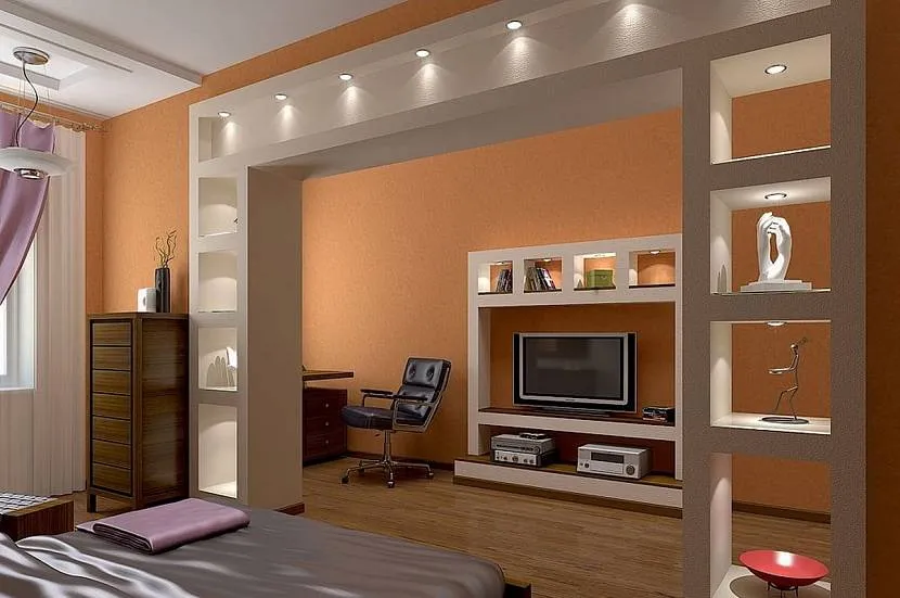 Создать уют в зоне спальной комнаты можно при помощи ниш, в которых можно разместить спальные принадлежности. Создание ниш уместно и в зале, ведь там поместятся телевизор, различные статуэтки и прочие милые вещи.