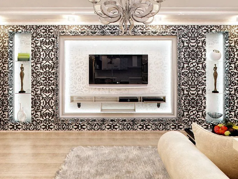 - Обои. Применяются чаще для неглубоких конструкций. С их помощью можно придать комнате как современный вид, так и добавить винтажный оттенок.