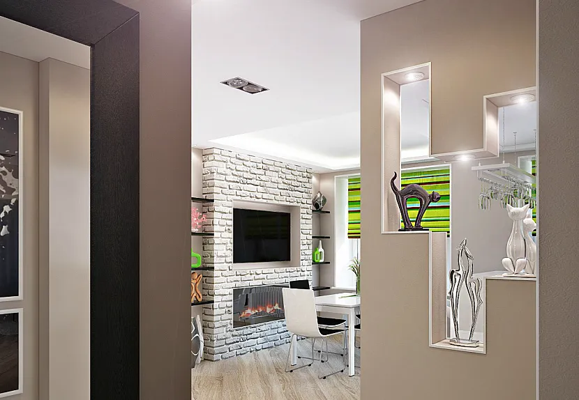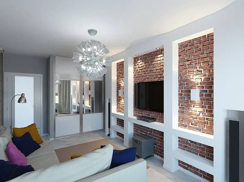 Еще больше выделить и акцентировать внимание на не сквозном проеме с тв-панелью получается за счет имитации кирпичной кладки.