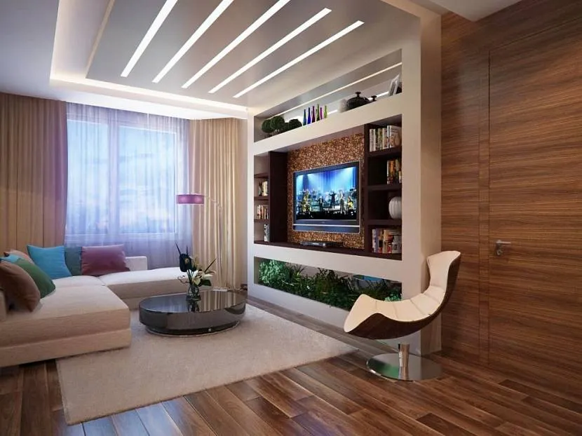 Вместо деревянного шкафа для телевизора и другой техники в зале можно сделать глубокую нишу с подсветкой своими руками. Если пространство позволяет, соорудите большое углубление, а телевизор прикрепите к стене. В маленькой комнате ниша используется как полка для телевизора.