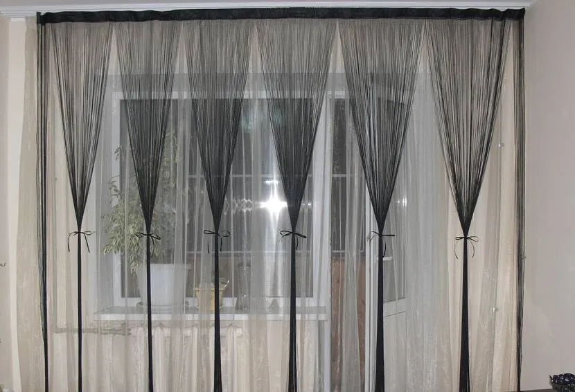 Занавески из нитей часто комбинируют с другими видами штор: плотными портьерами, гардинами, жалюзи или такой же кисеей, но другого цвета. В сочетании с оригинальной драпировкой такие многослойные шторы выглядят очень красиво.