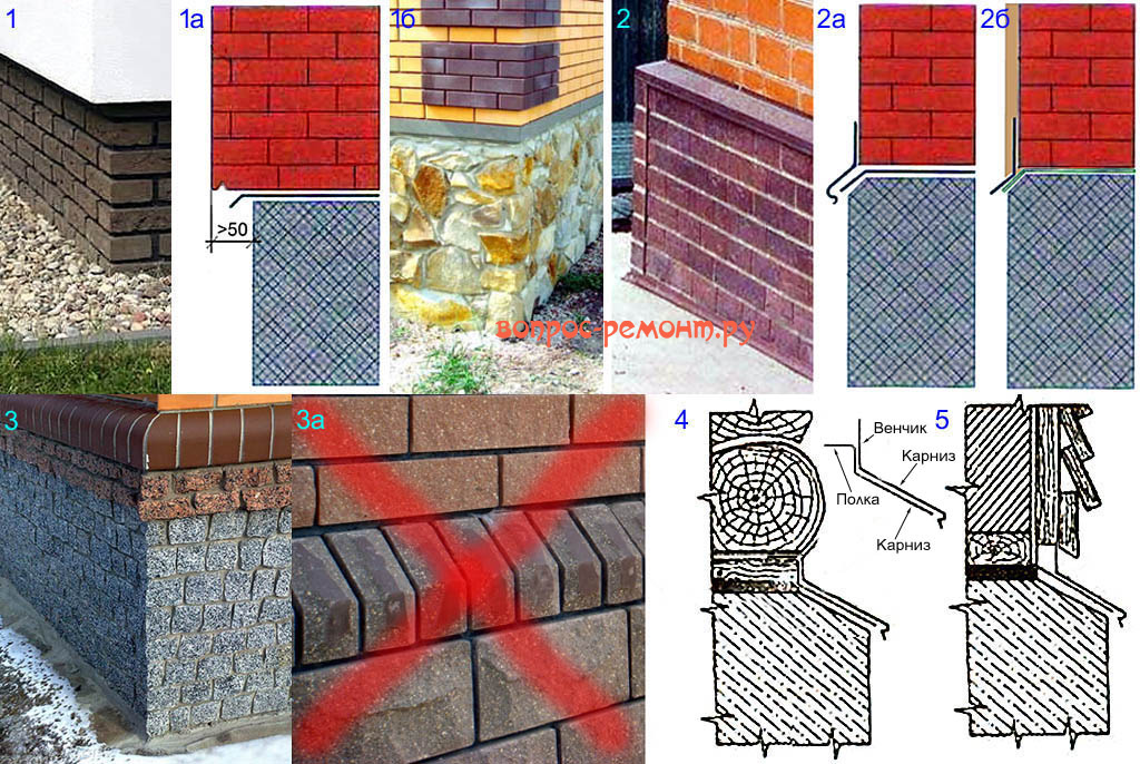 Возможные варианты конструкции цоколя с отливом показаны на рис. Если цоколь западающий (поз. 1) – вам повезло. Простой одинарный отлив укладывается между слоями изоляции; если еще снизу на выносе стены выбита канавка-слезник (капельница), поз. 1а, то капиллярное замокание стен исключено. Но тогда или стена должна быть от 2,5 кирпича, или надподвальное перекрытие плитным, поз. 1б. Последнего варианта бюджетные застройщики избегают – дороговато – а зря: потом, в процессе эксплуатации дома, плитное перекрытие оправдывает себя с лихвой. Тем более, что на, фактически, втором основании дома можно возвести коробку полегче и дешевле. Также в таком случае можно строиться из пено/газоблоков, облицевав затем дом кирпичом, что солидно выглядит и недорого.