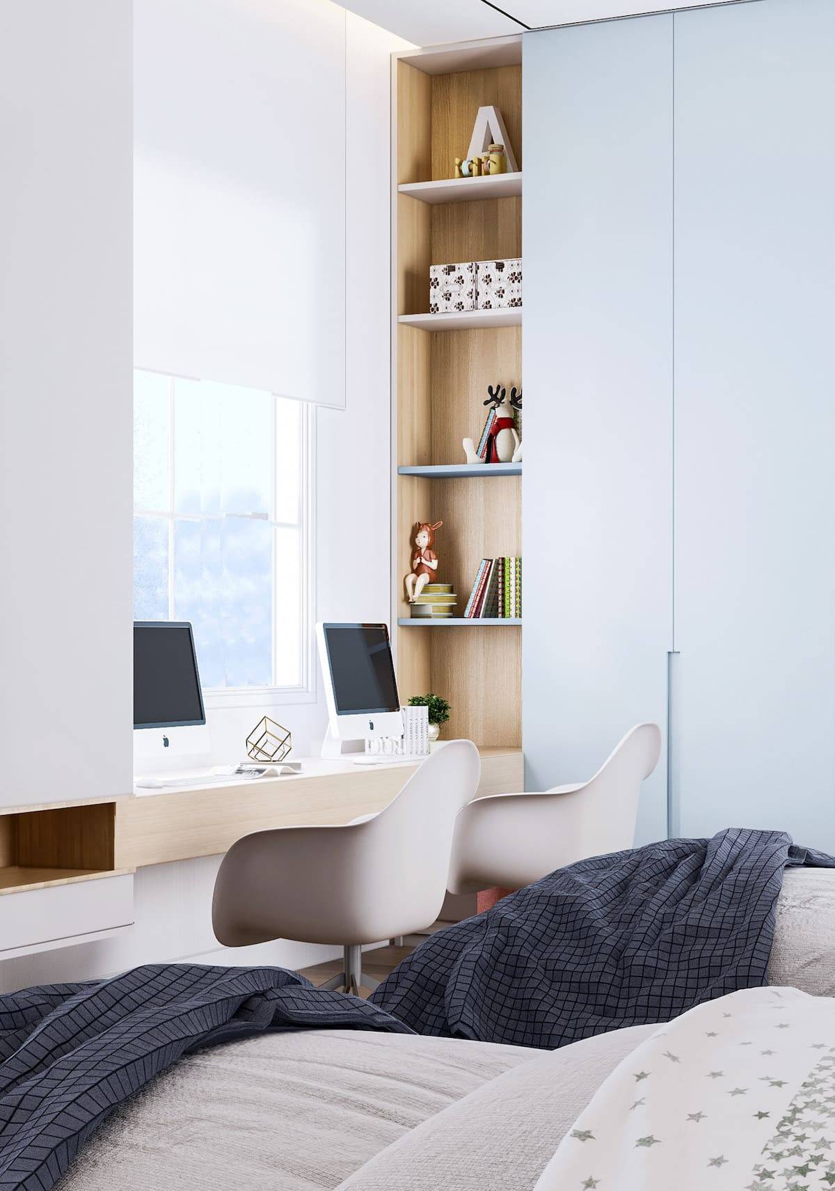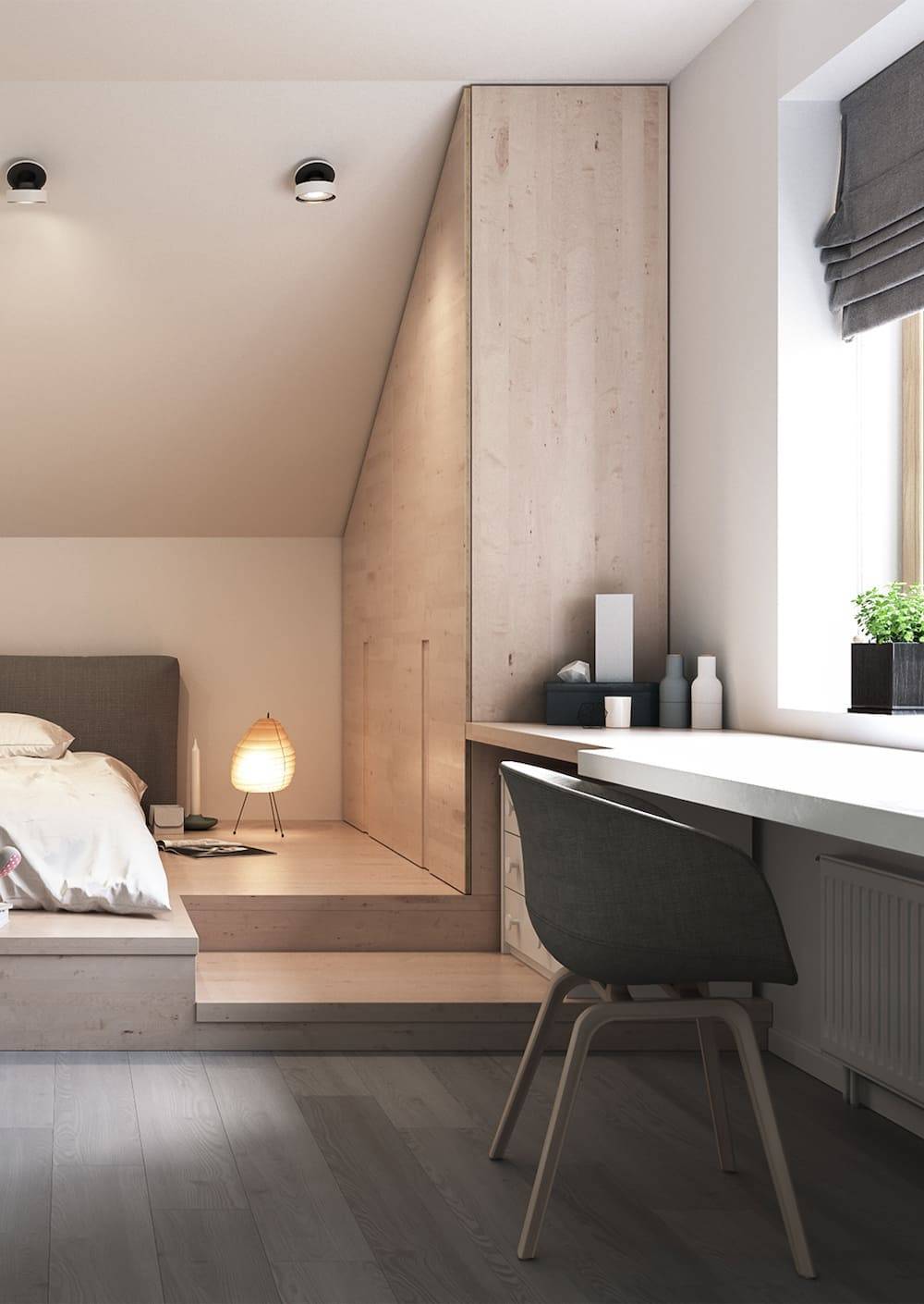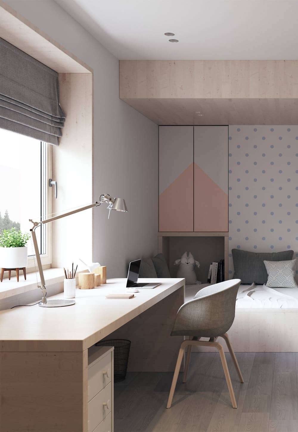 Спальню подростка рекомендуется разделять на несколько зон – это нормализует сон, концентрирует внимание при выполнении школьных заданий.