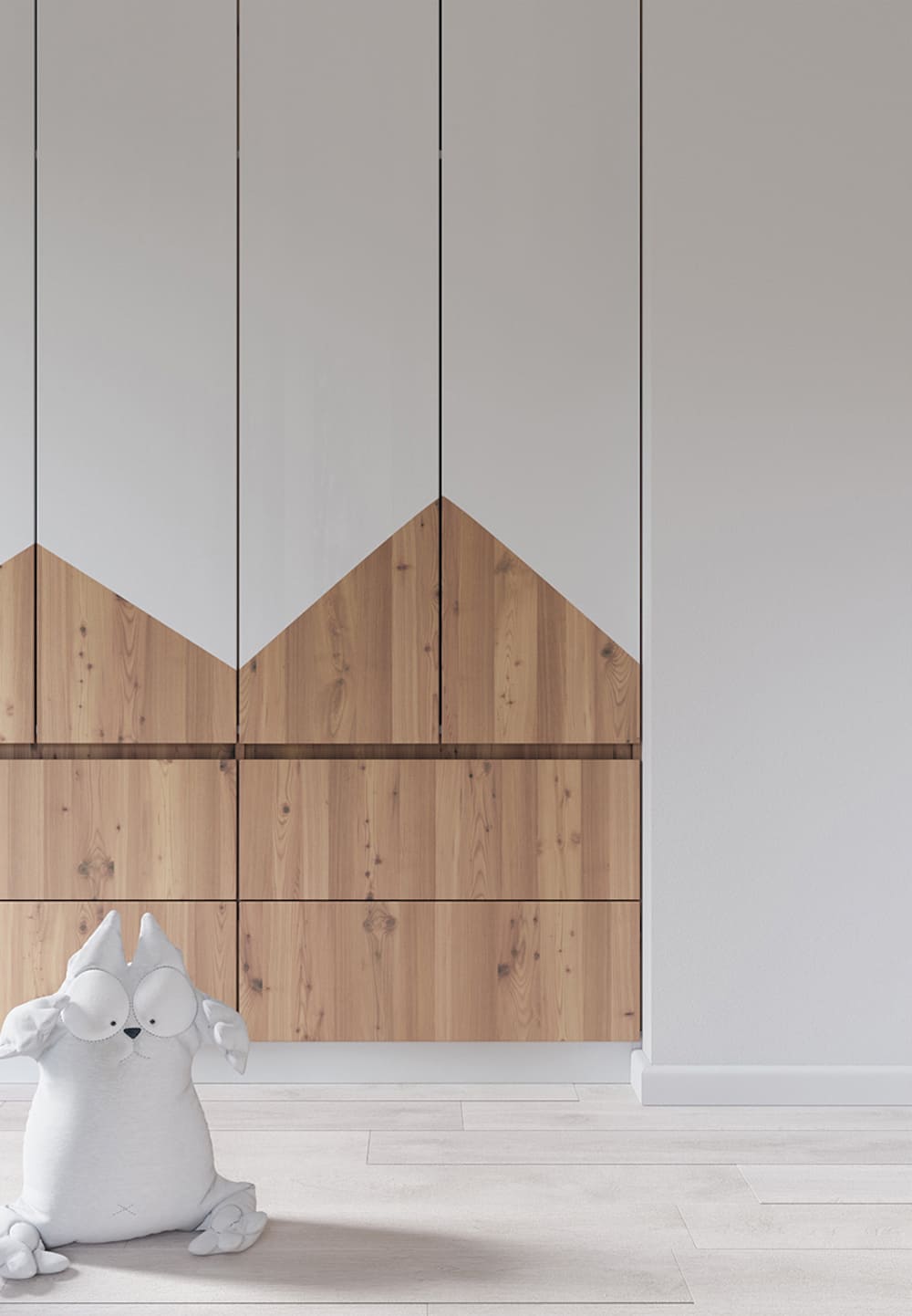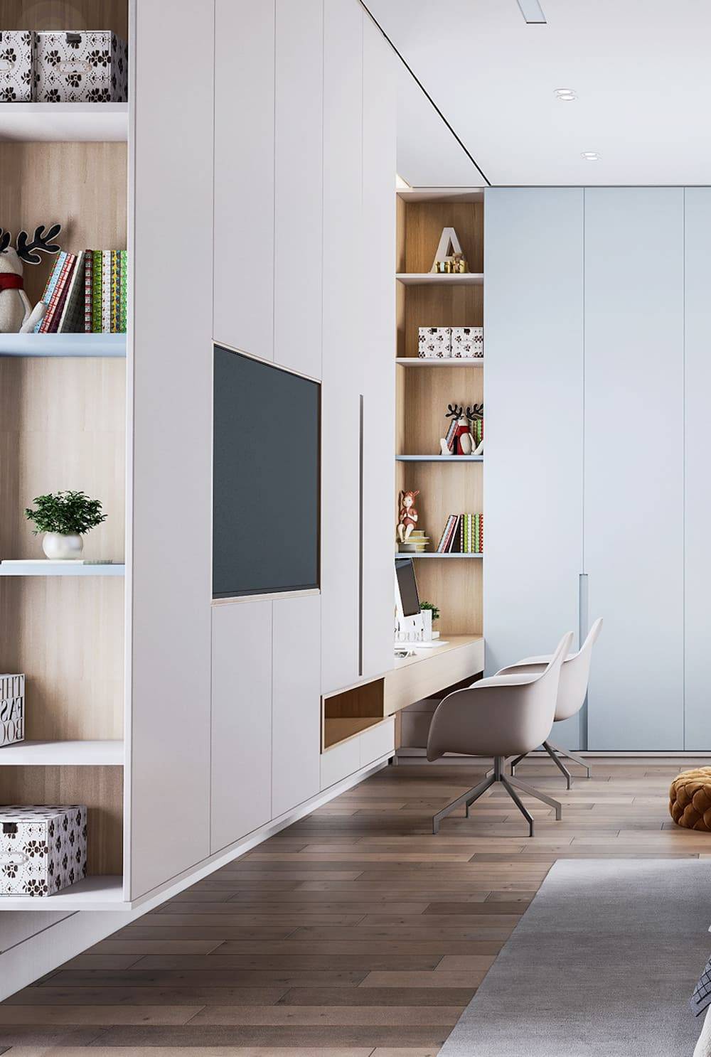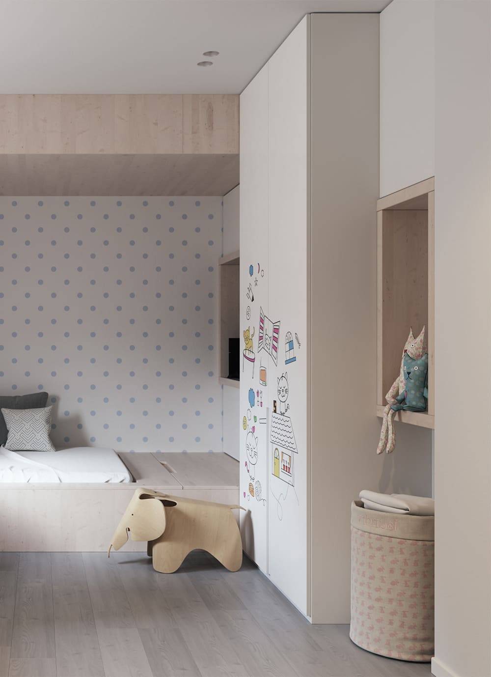 Помещение, в котором живут дети, должно выполнять несколько функций. В этой комнате младшие члены семейства делают уроки, рисуют, лепят, спят, играют. Здесь находится плательный шкаф с нарядами, игровая зона, спальный уголок.