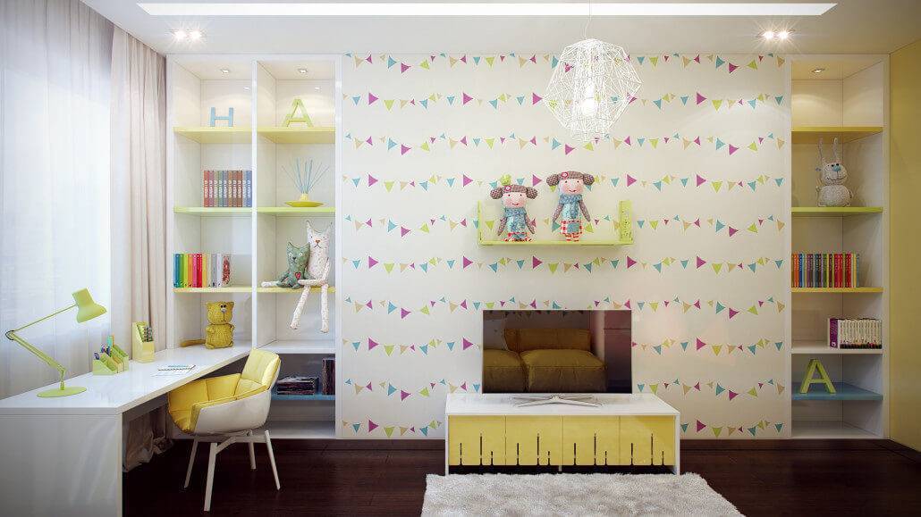 Желтые обои компенсируют отсутствие солнечных лучей в сочетании с правильно организованным искусственным освещением детской комнаты
