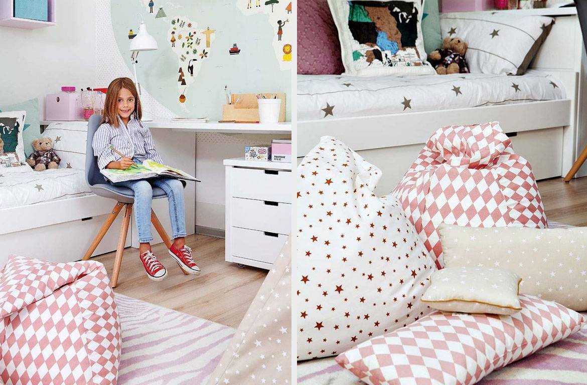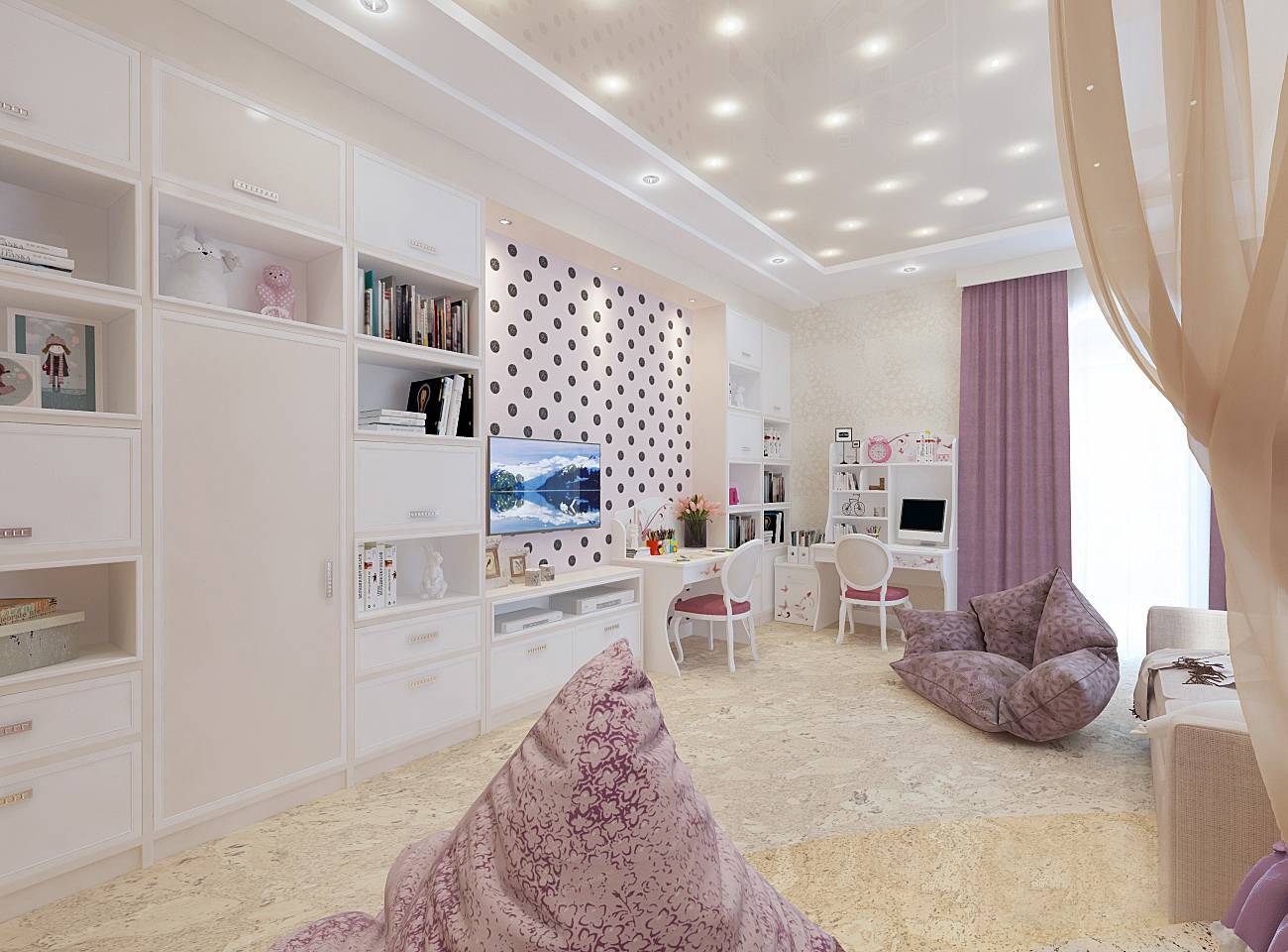 Когда метраж позволяет, делить на зоны лучше перегородками. Они отделят рабочее и спальное место от игровой зоны. Отлично обустроить в комнате девочки подиум: даже подросток будет ощущать себя звездой, красавицей и умницей. В декоре должно быть много текстиля, забавных подушек, пледов, штор.
