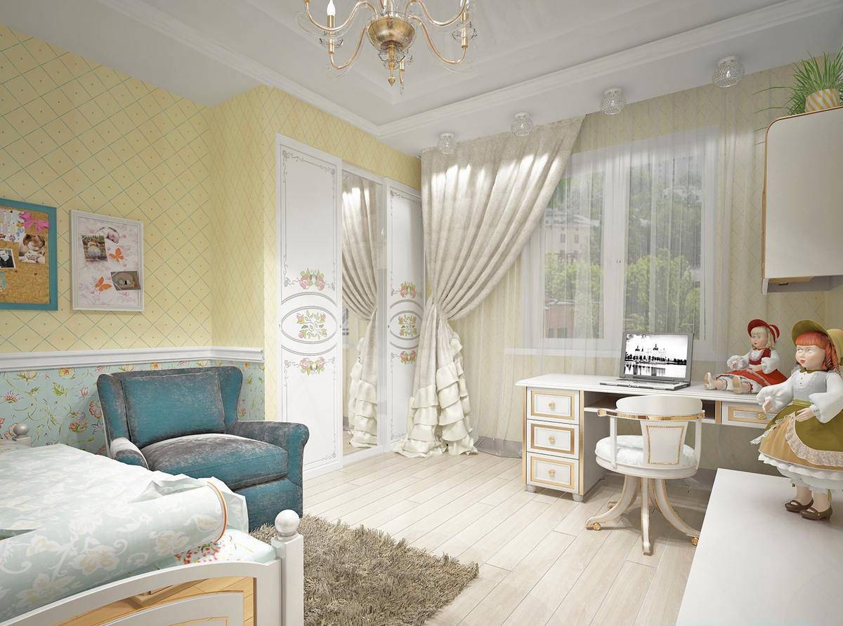 Детская комната для девочек с обоями спокойных тонов на стенах