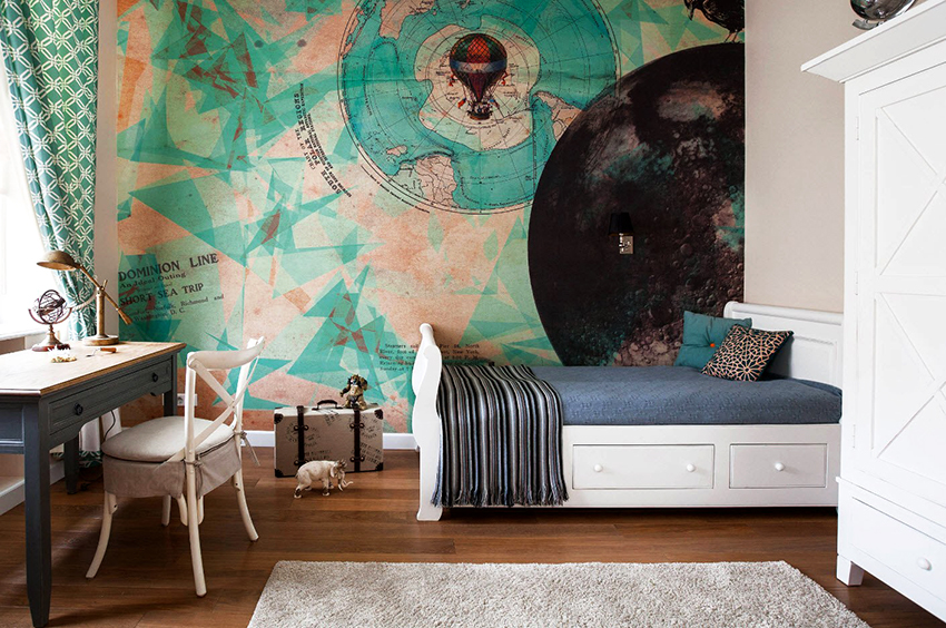 Для таких интерьеров подойдут обои с изображение ретро-автомобилей, самолетов, химических формул, молекул ДНК и всего того, что связано с техникой и научной сферой. На одной из стен можно изобразить контур самолета или машины, который будет светиться в темноте.