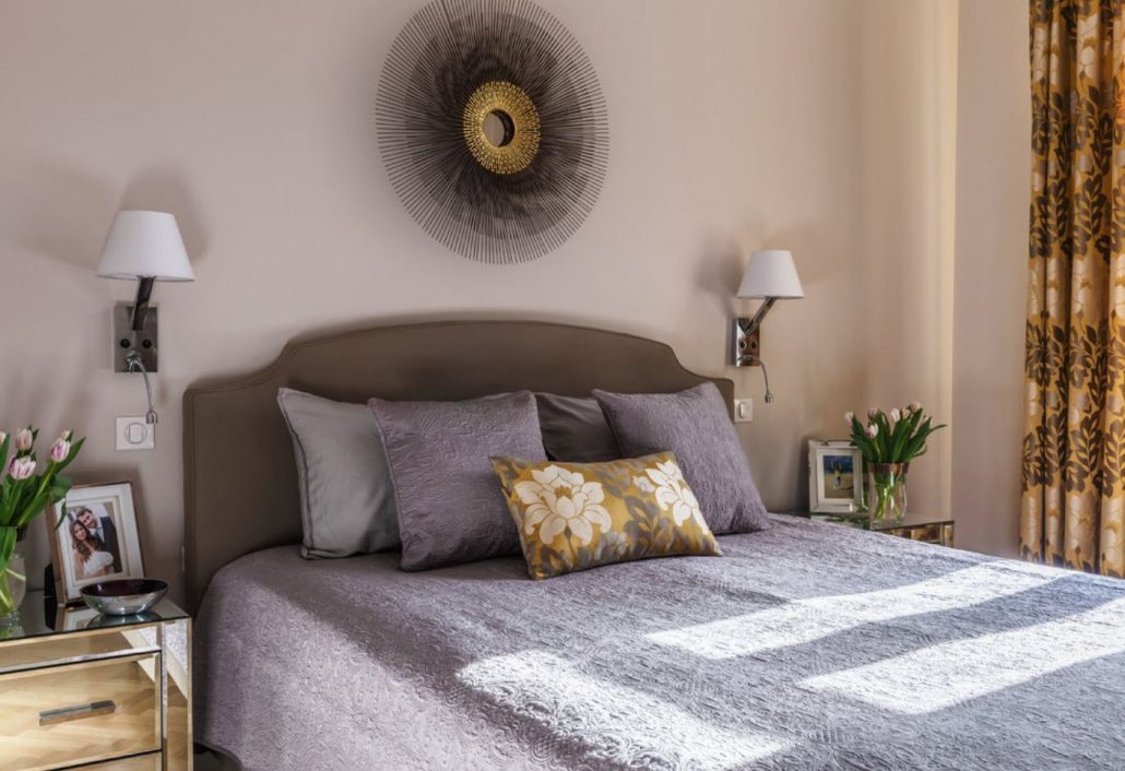 На фото блестящие золотые детали на стене создают иллюзию объемной поверхности и делают маленькую комнату больше за счет отражающих свойств.