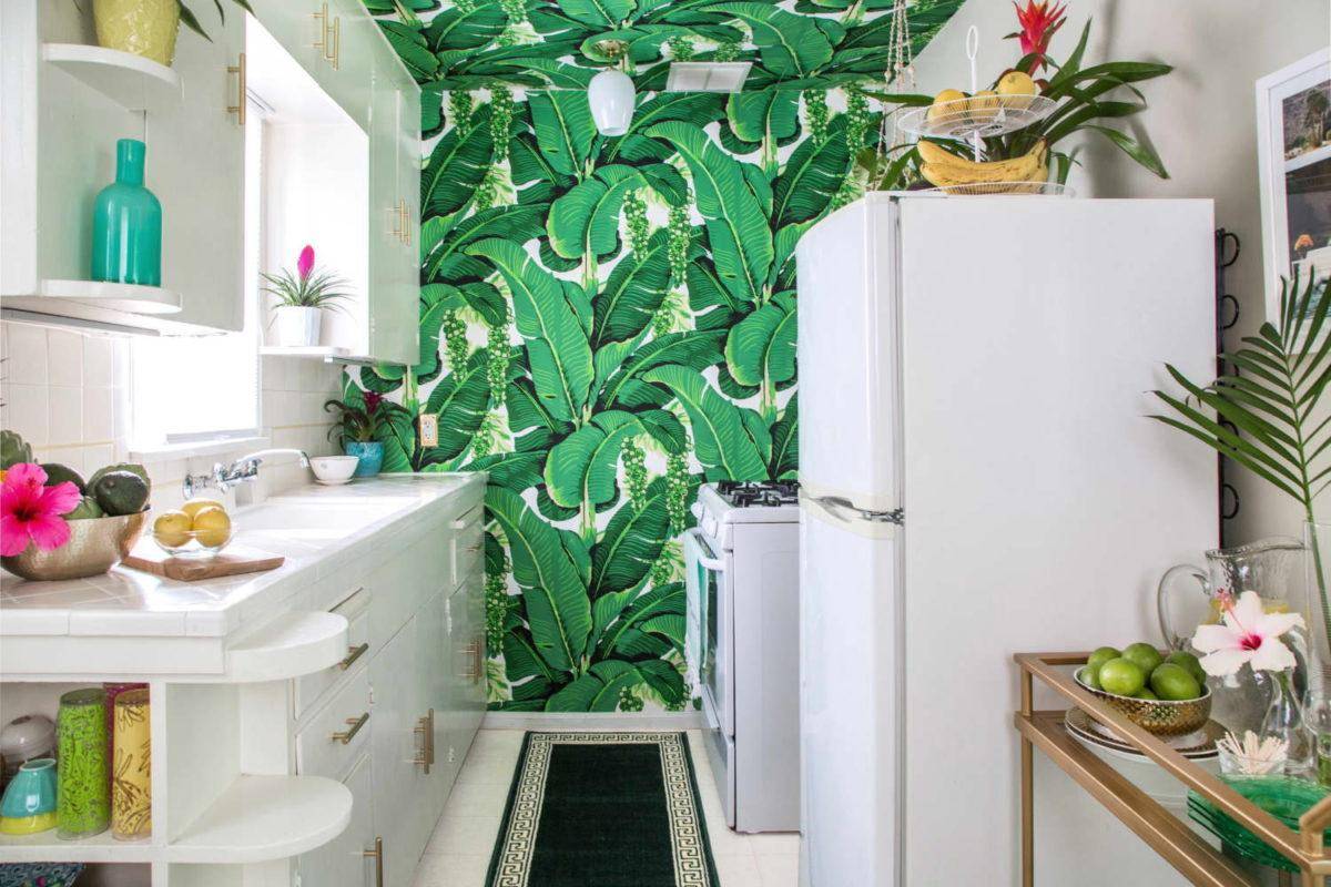 - Растительные принты. Под это определение подпадают изображения листьев, ветвей, деревьев и др. Подобная отделка наполняет атмосферу кухни свежестью, идеально подходит для дизайна в экостиле.