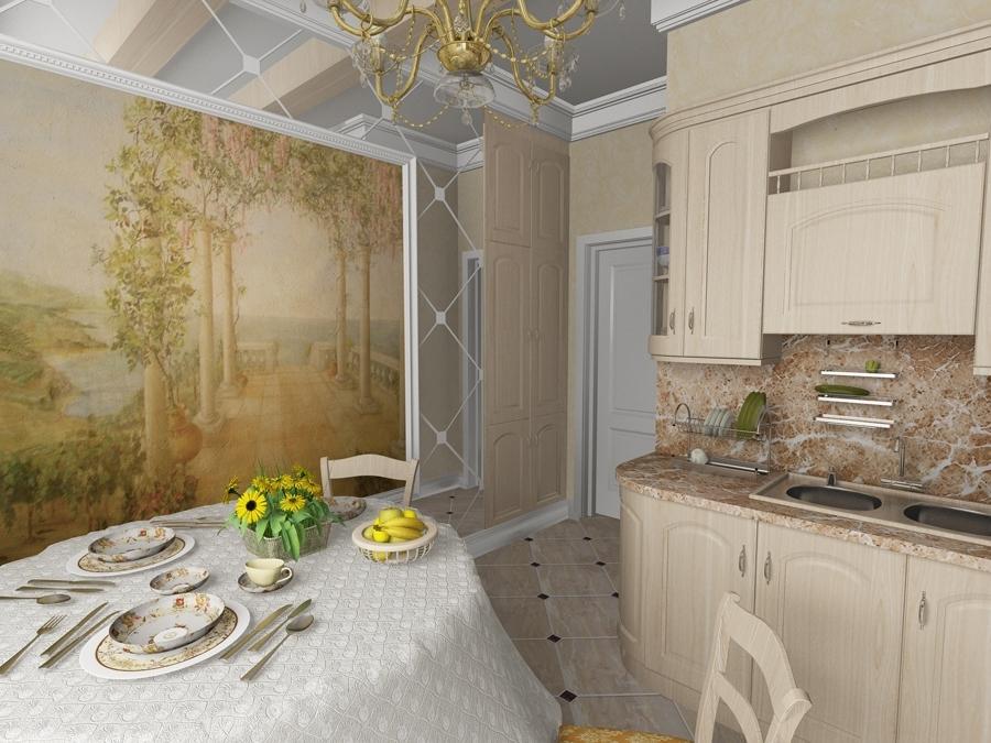 Необычный дизайн можно создать с помощью фотообоев, способных за счёт своего рисунка увеличить кухню маленькой площади, например, с нанесённым панорамным фото, изображающим перспективу — такие обои вытягивают помещение.