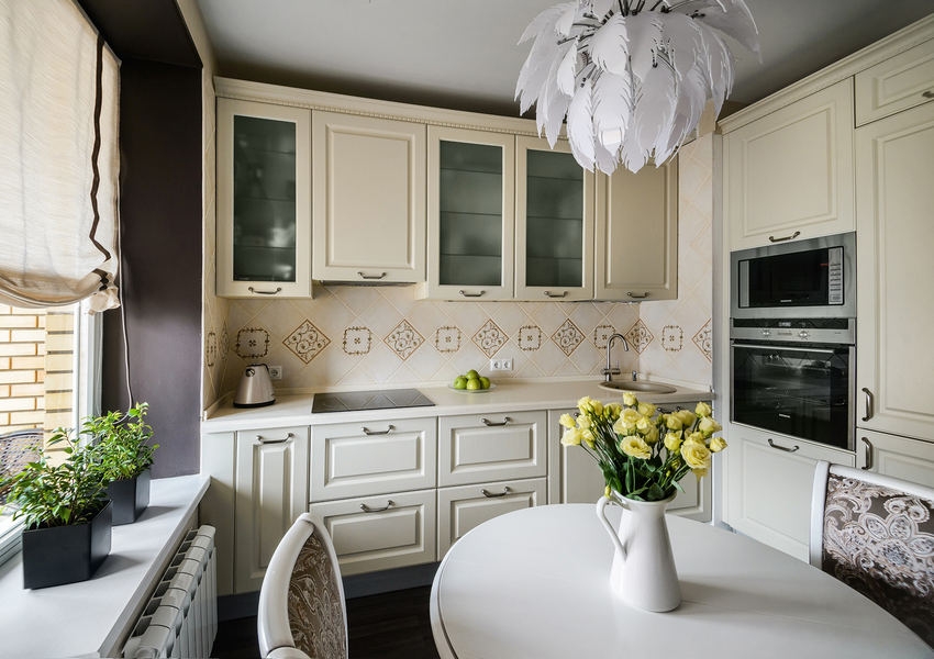 Для оформления интерьера кухни в классическом стиле лучше использовать гарнитур цвета слоновой кости
