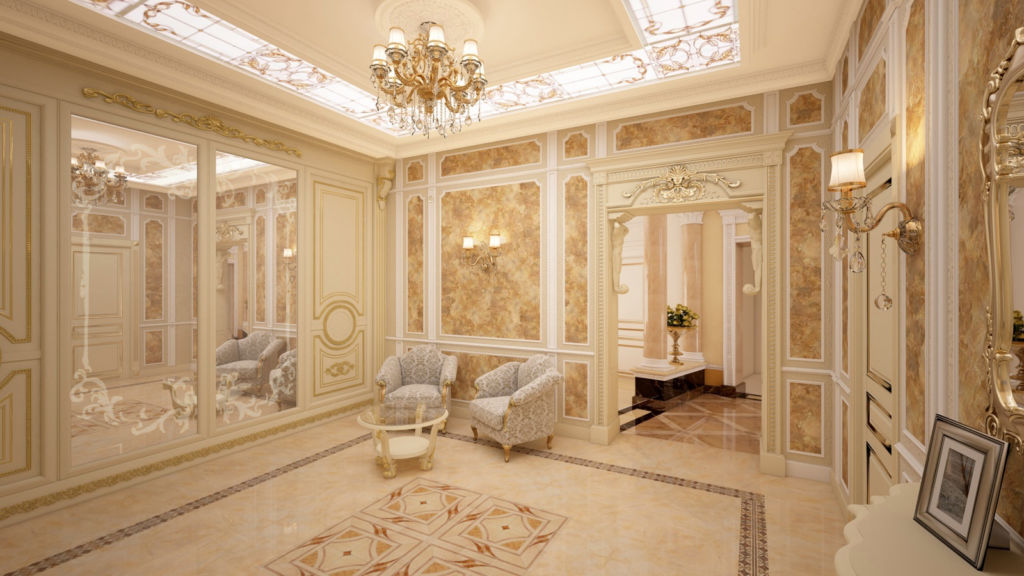 - сделать королевский дизайн можно посредством комбинации фактурных обоев терракотового оттенка с панелями бежевого цвета: добавив в интерьер картины и зеркало с позолотой и поддержав идею посредством настенных светильников с золотой отделкой, можно подчеркнуть особый статус;