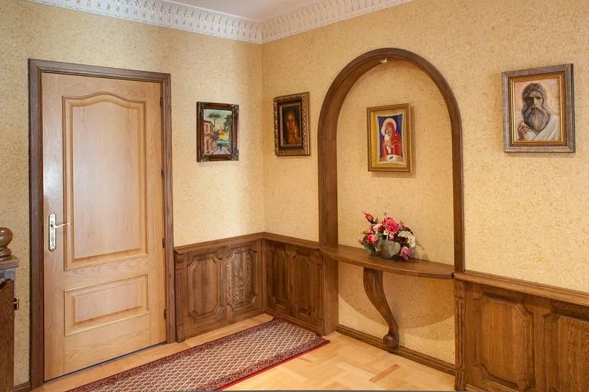 Для прихожей в стиле — Классика лучше комбинировать обои с панелями из натуральной древесины. Низ помещения отделывается панелями, а верх полотнищами на тканевой либо бумажной основе.