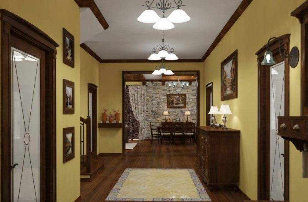 Низ прихожей в этом стиле рекомендуется отделать деревянными панелями.