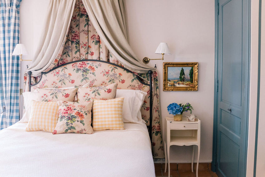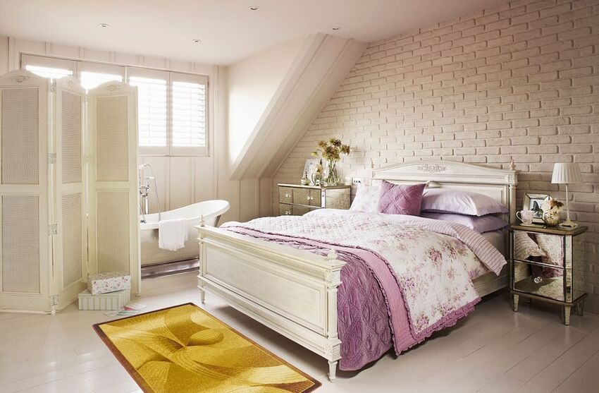На пол можно постелить небольшие ковровые дорожки в клетку или с растительным орнаментом. Цветочные узоры преобладают в качестве рисунков на комплектах постельного белья, а деревенские мотивы — на кухонном текстиле. Спальню можно украсить воздушным балдахином с ручной вышивкой.