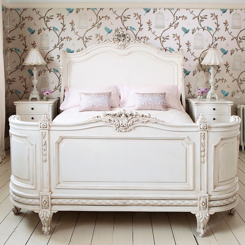 Деревянная модель в стиле прованс должна быть на ножках и украшена резными замысловатыми элементами, с высоким изголовьем. Его можно украсить художественной росписью, обить тканью или оформить в технике декупаж.