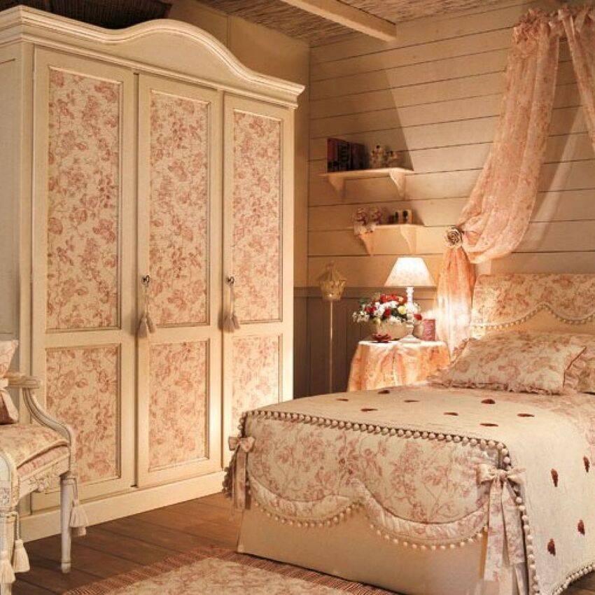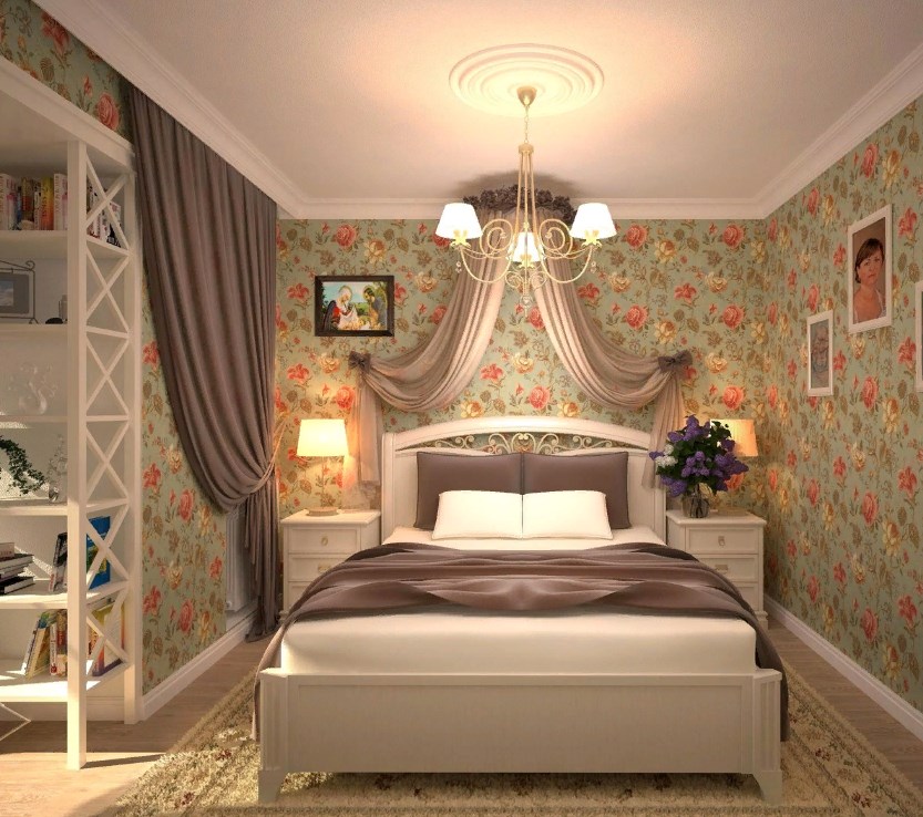 Обои с мелкими цветами в интерьере спальни в стиле прованс.