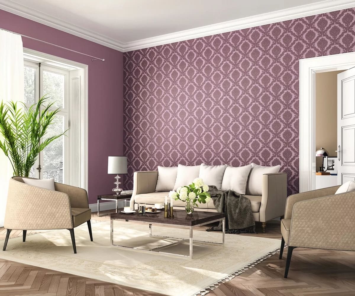 Крупные рисунки украшают стены зала и привлекают внимание. А мелкий узор вполне способен стать фоном для изысканной мебели