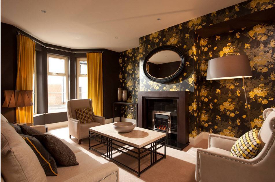Стены по обе стороны камина оклеены цветочными обоями