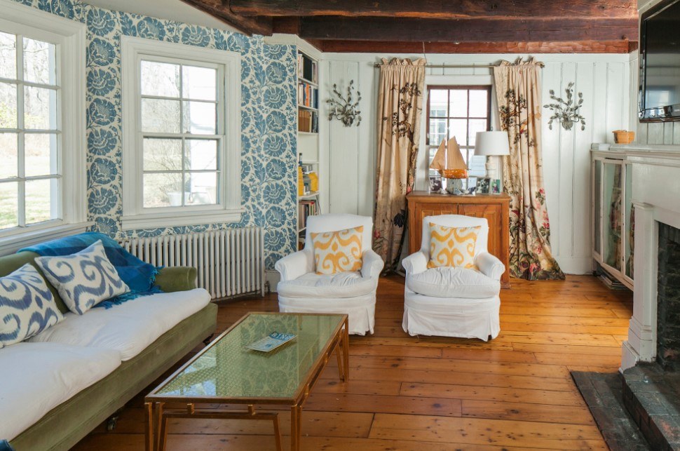 - Оттенки, использованные на стенах, должны в обязательном порядке повторяться в интерьере. Например, если берутся синие обои с золотым рисунком, то синий должен повторяться в обивке мебели, покрывалах или напольном покрытии, а цвет узора остается для аксессуаров, штор.