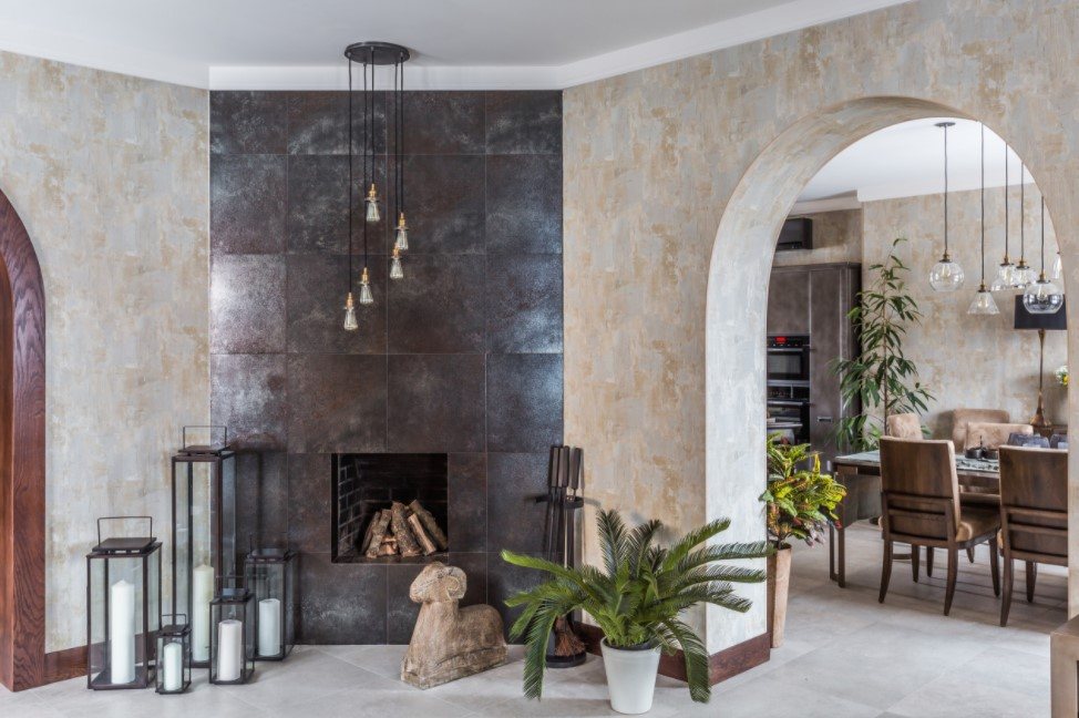 Оформление гостиной в стилистике модерна предполагает обязательное присутствие металлических деталей, каменных поверхностей, древесины, кожи или меха. Поэтому идеальным выбором для отделки стен в такой гостиной станут всевозможные природные мотивы или мозаика, в которых отсутствуют строгие линии и чёткие формы.
