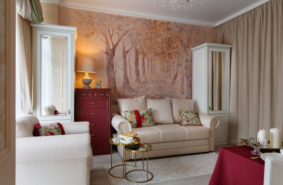 В первом случае предполагается создание стильного фона, поэтому обои должны быть выполнены в светлых тонах. Поскольку узоры на таком фоне будут выделяться, проконтролируйте, чтобы этот цвет повторялся в некоторых деталях интерьера.