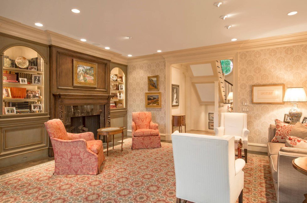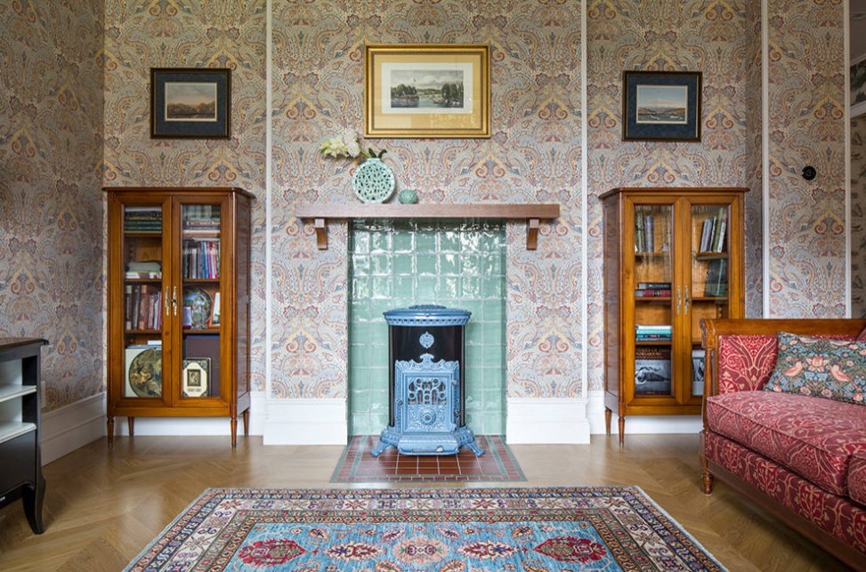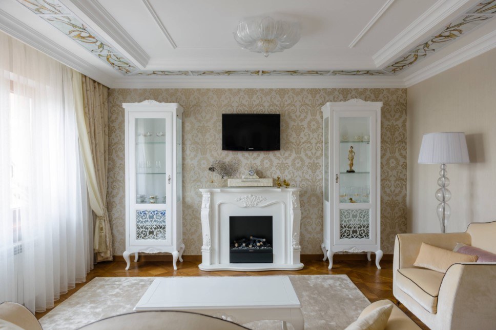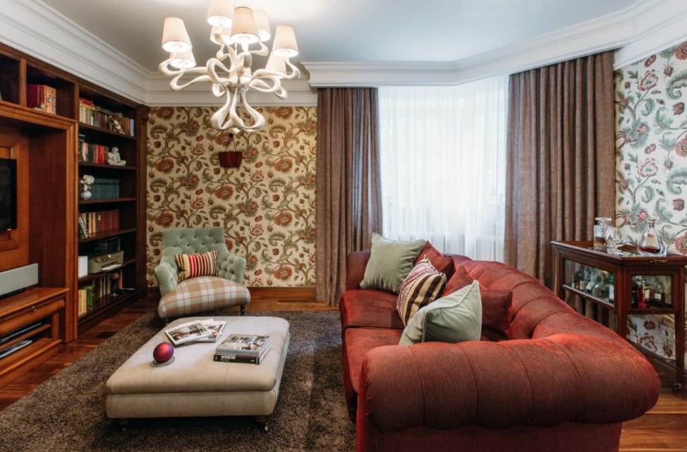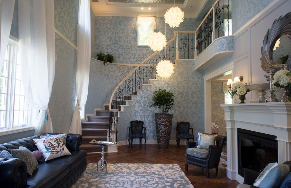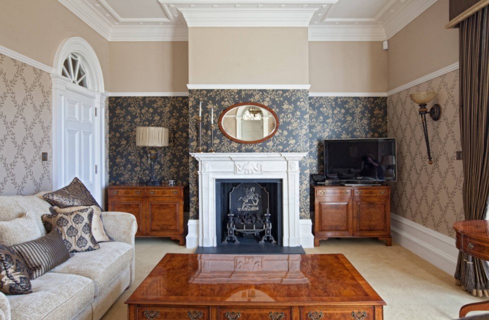 Если в гостиной есть камин, то обои с вензелями лучше всего разместить на его же стене, выделив нишу. Крупный рисунок применяется только в просторных комнатах, не перегруженных предметами мебели. Яркие цвета нуждаются в дополнительном освещении. Оно может проходить только в верхней части или по всему периметру стены. Кстати, участок возле балкона – не лучшее место для вензелей. Большую часть дня они будут просто незаметны.