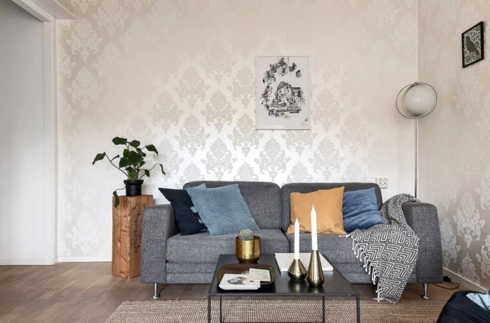 В атмосфере гостиной в скандинавском стиле должен поддерживаться дух жилищ северных широт. Поэтому светлые обои, имитирующие кирпичную кладку или грубую штукатурку в этом случае способны наиболее максимально передать скандинавскую самобытность.