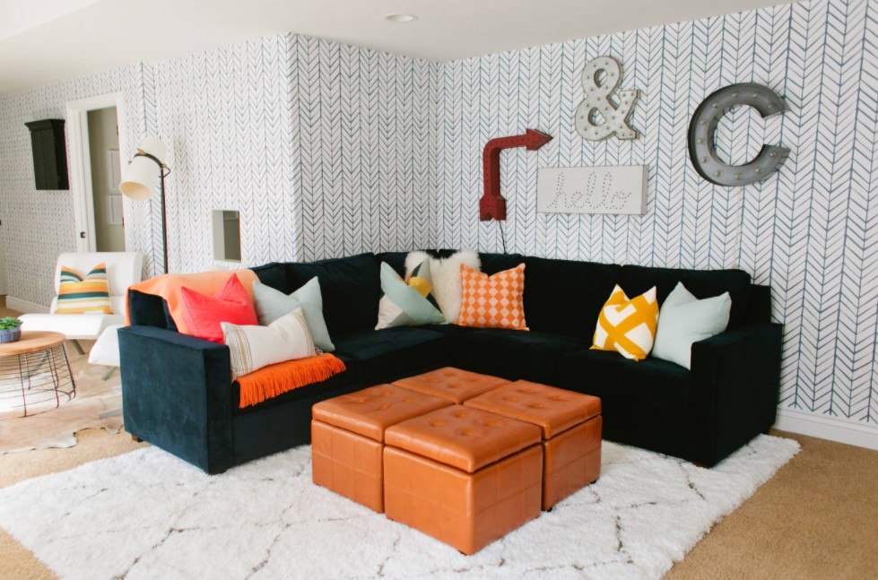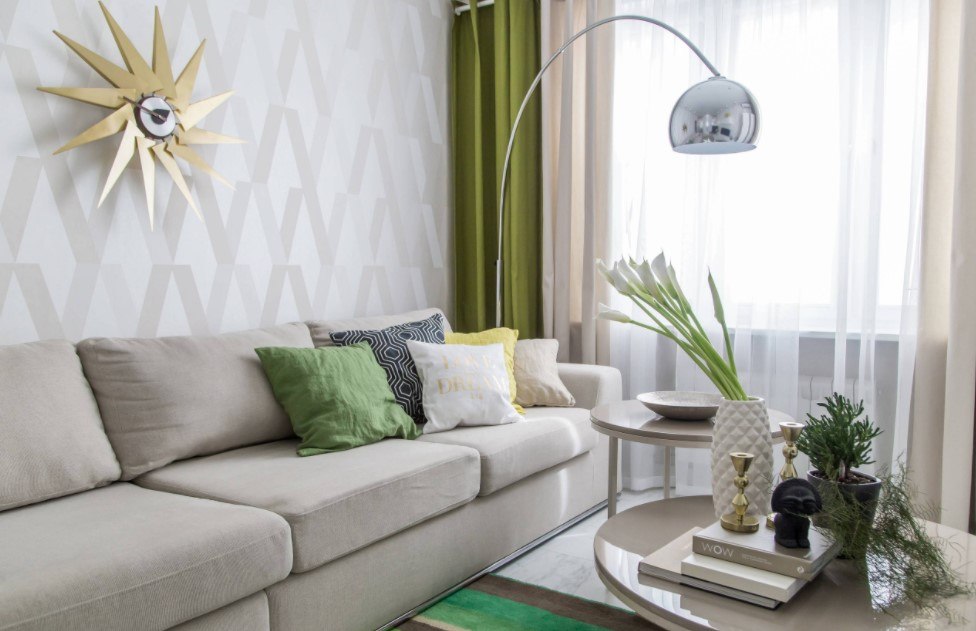 Нежный деликатный геометрический узор с интересной формулой гармонично будет сочетаться с остальными добавками и пастельными или белыми стенами.