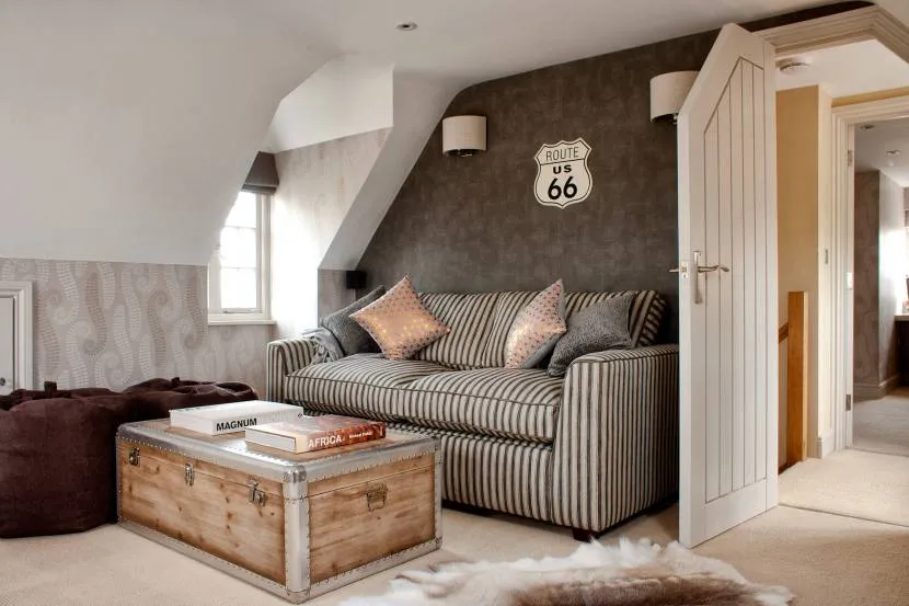 Комната на мансардном этаже – это отдельный уютный уголок в доме. Стены могут украшать обои с мелким растительным или цветочным узором, имитацией под дерево или спокойное однотонное полотно.
