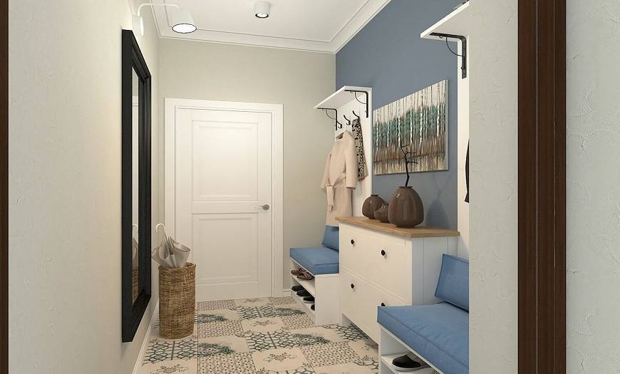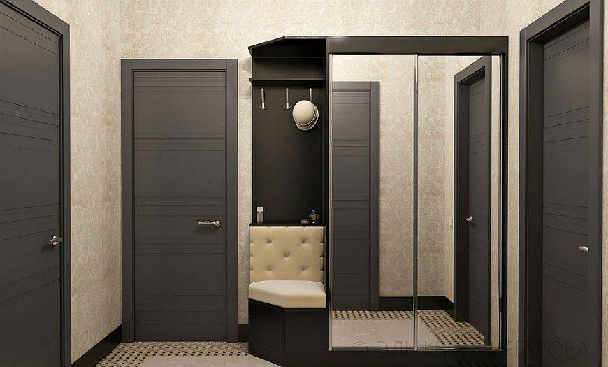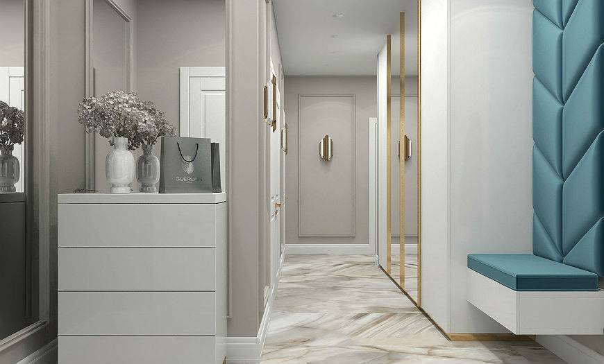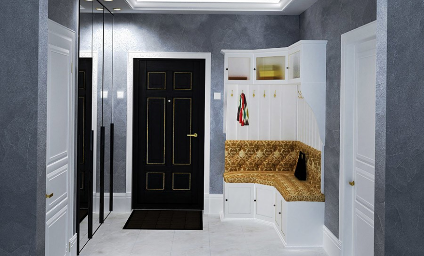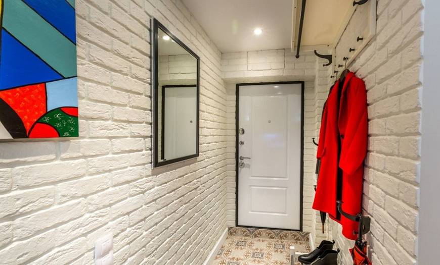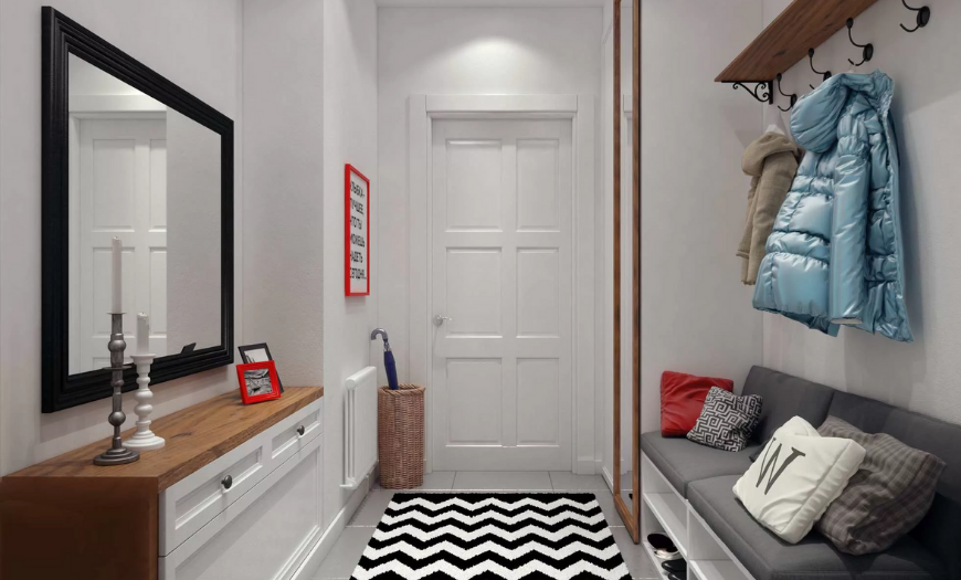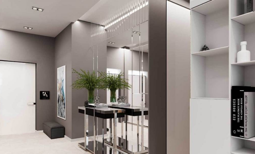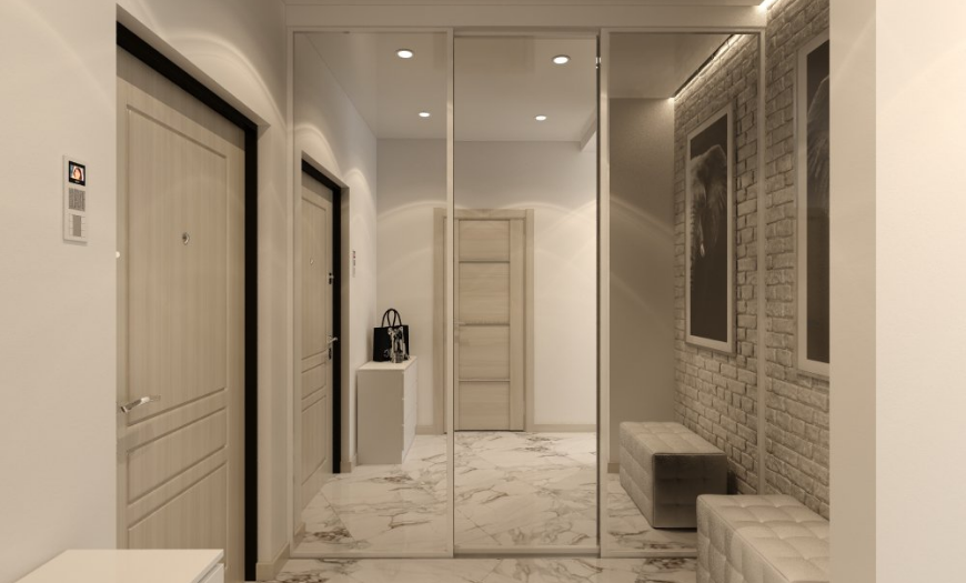 В таких условиях тяжело установить вешалку для одежды или полку под обувь. Поэтому основной акцент нужно сделать на отделку, не пытаясь разместить какую-либо габаритную мебель. Из-за отсутствия естественного освещения используют зеркала и глянцевые поверхности.
