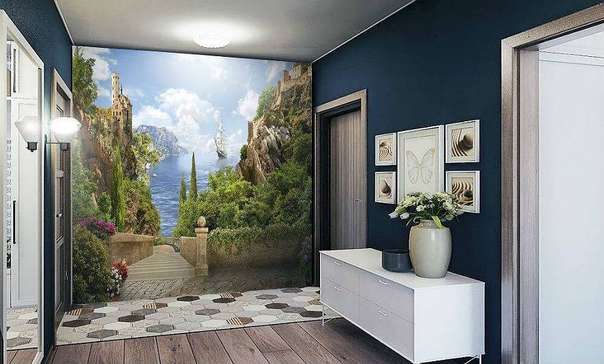 Цветной рисунок на обоях в коридоре смотрится достаточно свежо