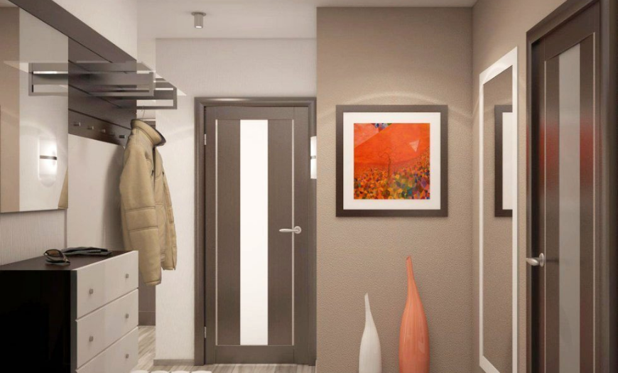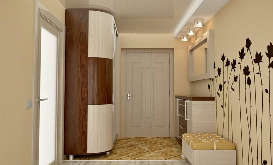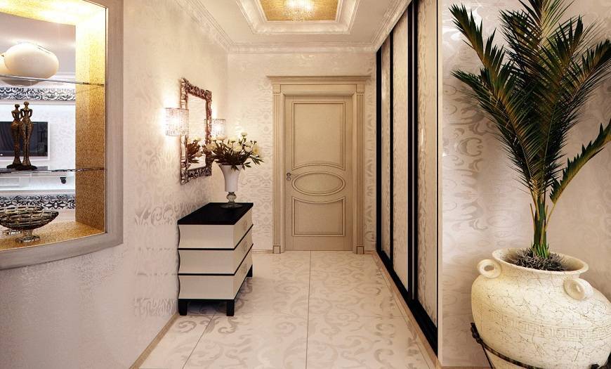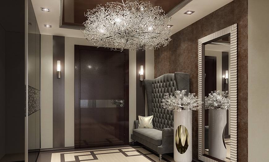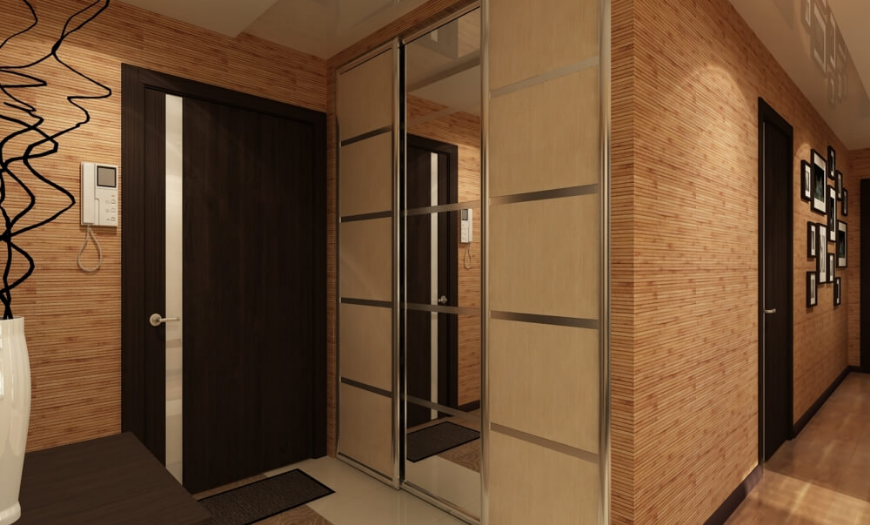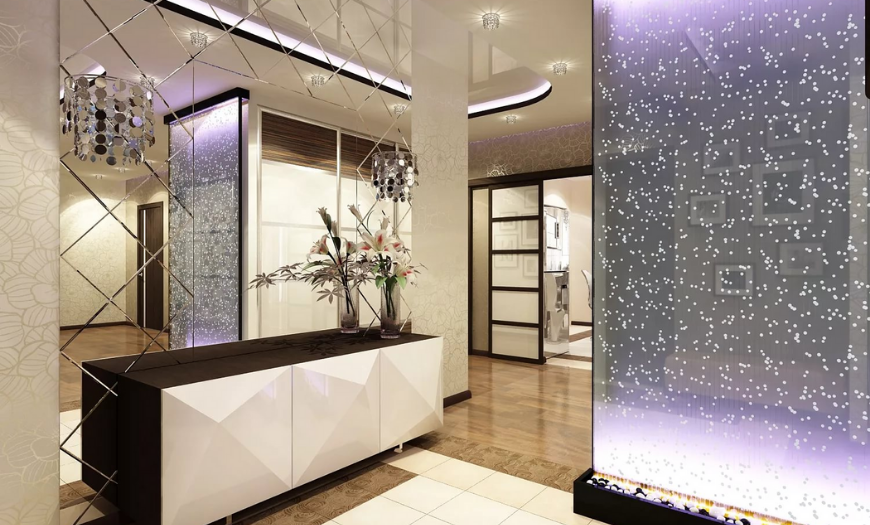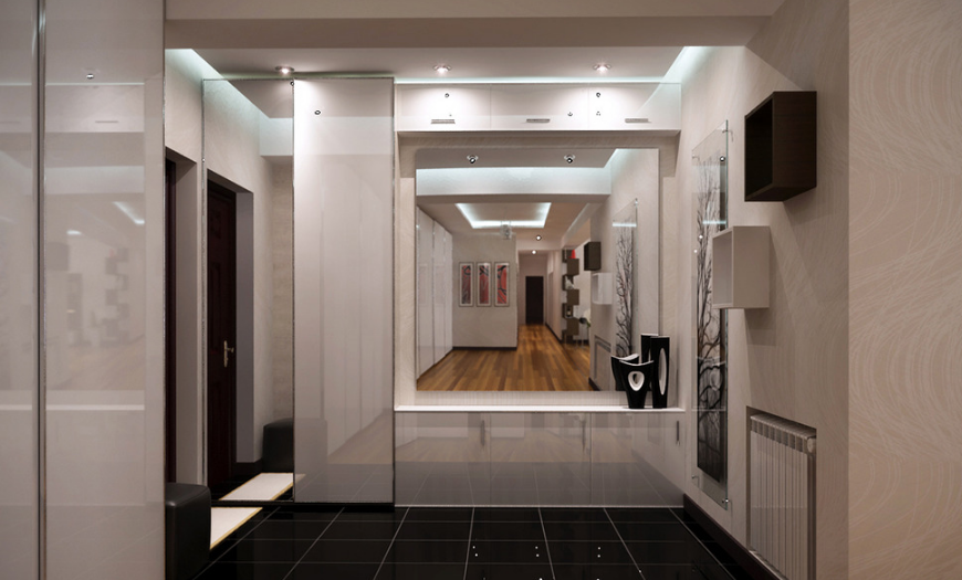 При планировке интерьера руководствуются желанием визуально расширить помещение. В узкой прихожей будет уместно декоративное панно с отражающим эффектом.