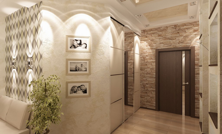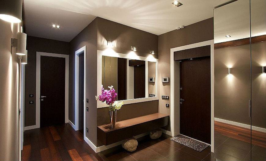 Разделить прихожую на несколько функциональных частей и визуально увеличит пространство (для узких коридоров) можно и с помощью освещения. Не рекомендуется делать только один источник света. Лучший вариант – несколько небольших светильников, например, светодиодных ламп. Их можно вмонтировать в потолок.