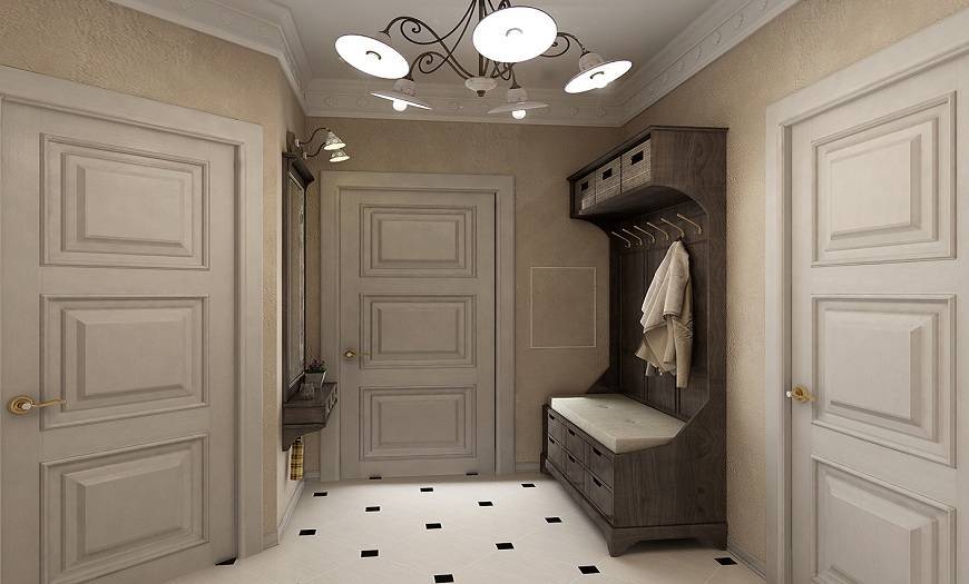 Самое популярное цветовое решение в современных прихожих – это различные оттенки бежевого. Вкупе с классическим стилем в оформлении всего помещения такой дизайн оставляет приятное впечатление – ощущение покоя, устроенности, величия. Бежевый цвет смотрится благородно, не раздражает, сочетается с добротной природной текстурой деревянной мебели и дверей в маленькой прихожей.