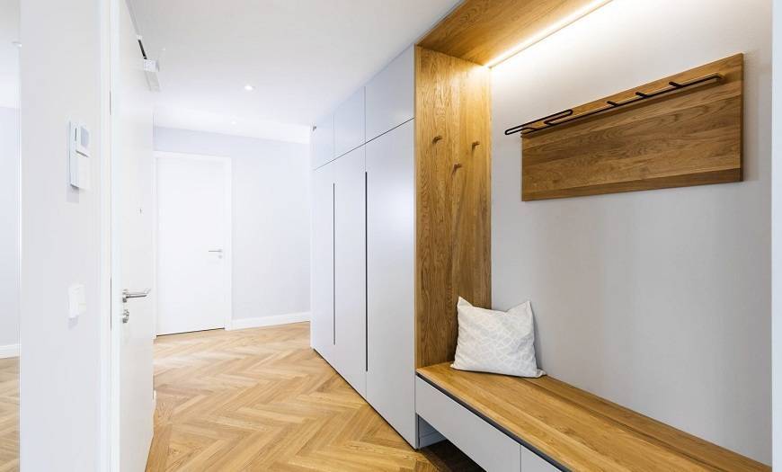 Недостатком такой планировки считаются сложности при размещении мебели. Если установить в коридоре шкаф, то он может затруднить проход в другие части жилища. Поэтому в дизайне узких и прямоугольных прихожих предусматривают компактную меблировку с применением модульных вариантов.